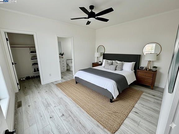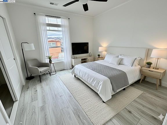 Farmhouse-style sinkStainless steel appliancesLight gray plank flooringWhite cabinets