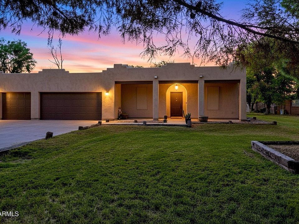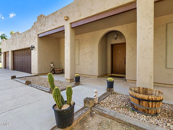 Beautifully remodeled country home in Chandler Heights on over an acre at the end of a no-through road. Brimming with charm, this peaceful retreat features a horse setup with round pen and stalls, 10' ceilings throughout, and a 12' ceiling in the great room with fireplace. Updates include new AC, roof repair and coating, and all-tile flooring. No HOA, block walls, and county island location offer added privacy. Property includes chicken coops, kennels, greenhouse, storage container, 2 sheds (one partially converted to a tiny home), portable restroom, underground irrigation, and RV hookup to septic.