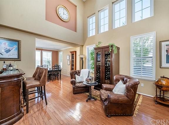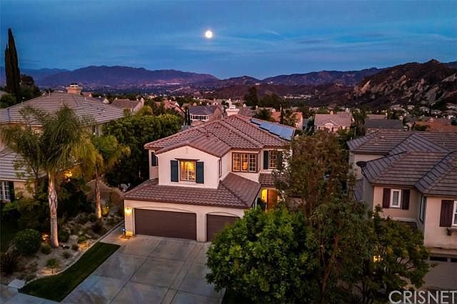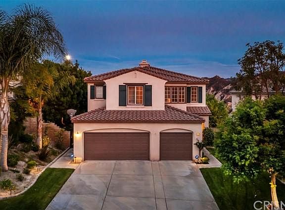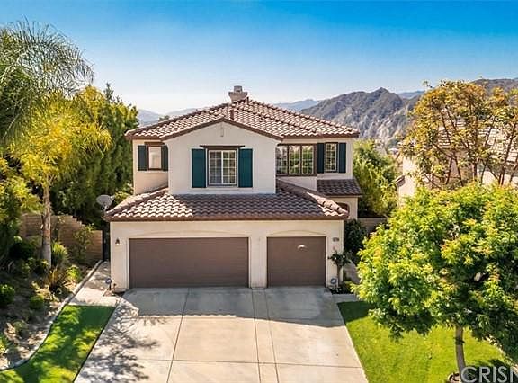 Stunning Stevenson Ranch VIEW home located on a premium lot with gorgeous mountain views. This home features 4 spacious bedrooms plus an office/den with beautiful custom glass doors and conveniently located on the lower level (possible to use as a 5th bedroom). A full bathroom is also conveniently located downstairs. The light and bright open floor plan includes a dining room and living room with vaulted ceilings. The kitchen is complete with granite counter tops, kitchen island and a window that is view facing! The kitchen has a slider for direct access to the immaculately landscaped backyard complete with patio cover, gas fire pit and numerous fruit trees lining the side yard- The perfect setting for just putting up your feet and enjoying the view. The family room has a fireplace and lots of natural light. Upper level features a built-in desk/work area, 4 large bedrooms, 2 baths, and laundry room. The large master suite boasts gorgeous mountain views and a master bathroom with his and hers vanities, walk-in shower, large soaking tub and DUAL walk-in closets. The large 3-car garage features a high speed charging hookup for Tesla electric vehicles. **SOLAR is OWNED** Other highlights include, crown moulding, hardwood flooring and recessed lighting. Walking distance to the Park and award winning Stevenson Ranch Elementary!
