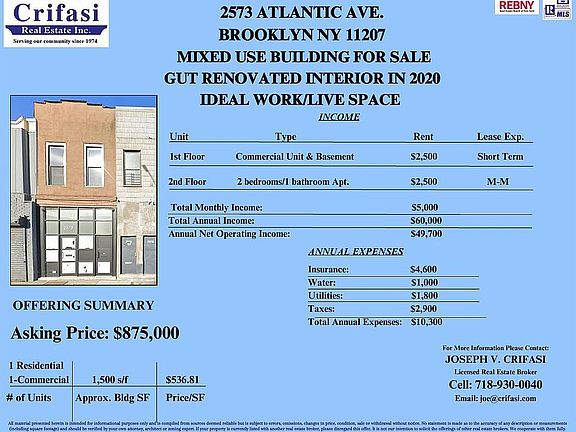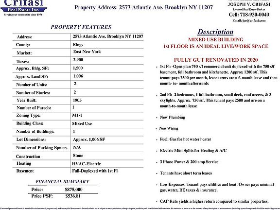 This mixed-use property offers an ideal live/work space. It has been Fully gut renovated in 2020 with all systems updated. The spacious duplexed studio, spanning approximately 1,400 sq. ft., includes a kitchenette, bathroom, and access to a full basement which is included with the unit. This unit is currently rented for $2,500 per month with a short term 6-month lease and then month to month afterwards. The second-floor unit, approximately 750 sq. ft., features a well-appointed kitchen, a bright living room, two bedrooms, and a full bathroom. The apartment boasts gorgeous wood floors, three skylights that flood the space with natural light, and access to a private deck and rooftop space. The Current tenants pay $2,500 per month and have a month-to-month lease. The storefront, basement, and back patio offer dual income. This property incurs low expenses with tenants paying all utilities and heat. The owner pays minimal gas, water, real estate taxes and insurance. With an approx. NOI of $50,600, based on CAP rates in the area this property offers a higher return compared to similar properties. Both units are equipped with mini-split systems for efficient heating and cooling, ensuring year-round comfort. This property has been thoughtfully renovated with all-new wiring, plumbing, and mini-split systems. Additionally, it is upgraded with 3-phase power and 200A service, offering optimal electrical capacity for modern needs. Please note, in order to view the 2nd floor on the video walk through: When the video starts, it shows the studio facing the kitchen and bathroom area. To access the second floor, you'll need to turn the view around to face the opposite door. There, you'll see a circle with an arrow. Hover over it, and an option to go upstairs will appear. Once you click this, it will take you to the second floor.