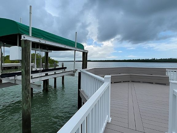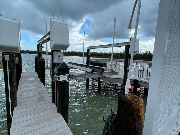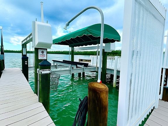 Slip #5 at Bonita Beach Club offers a 10,000-pound lift complete with a convenient walkboard on the far side for easy cleaning. The slip includes a GEM Box with remote, measures 10 feet wide between pilings with a 26-foot finger dock, and comes with a brand-new 8-foot West Marine dock box. Additional features include dock lighting, outdoor shower, water and electric outlet for trickle charging, and the allowance for one vessel per slip.