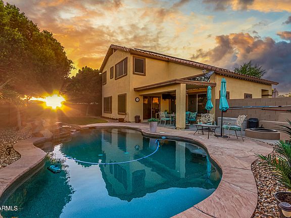 Look no further! Nestled in the heart of WESTPARK, this 2-story gem welcomes you with charming STONE accents on the facade and an RV GATE. Outdoors, unwind in the BACKYARD OASIS with a covered patio, fire pit, sparkling POOL, and breathtaking SUNSET views. Step inside to find tile and wood-look floors, VAULTED ceilings, and a cozy living room that invites you to relax. Entertain in the formal dining area or whip up culinary delights in the well-appointed kitchen, featuring wood cabinets, STAINLESS STEEL appliances, a WALK-IN pantry, and a spacious island with a breakfast bar. Retreat to the expansive main suite, complete with a SITTING AREA, double doors, a chic bathroom, and a WALK-IN closet. Carpeted LOFT makes for a perfect media center. Don't miss the chance to make this gem yours! EPOXY FLOORS in the garage for EASY upkeep and cleaning! NEW variable pump for pool in 2019. Exterior paint in 2020!