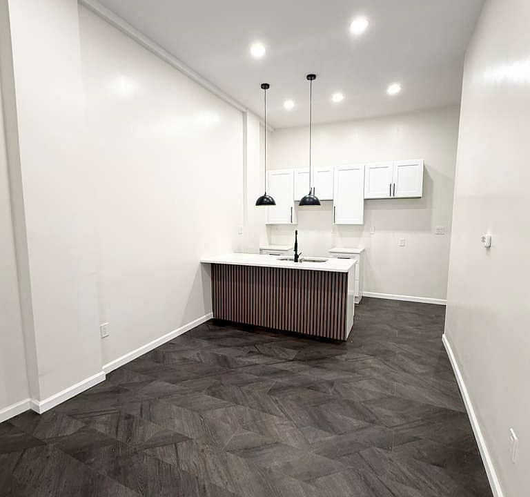 Step into a bright, open-concept living space featuring high ceilings, recessed lighting, and striking dark herringbone-style flooring that adds warmth and sophistication. The contemporary kitchen is designed for both style and function, showcasing crisp white cabinetry, a large waterfall island with decorative wood detailing, modern pendant lighting, and ample prep space which is perfect for entertaining or everyday living.