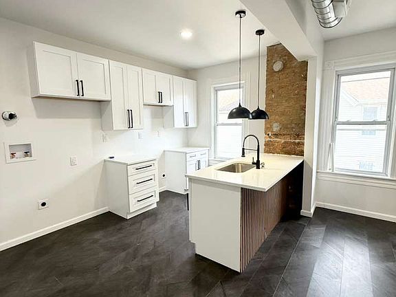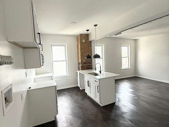 Step into this beautifully updated home featuring a bright, open-concept layout and modern design throughout. The living area showcases high ceilings, recessed lighting, and eye-catching dark herringbone-style flooring that adds depth and sophistication. The contemporary kitchen is the heart of the space, complete with crisp white cabinetry, a large statement island with sleek wood detailing, and modern pendant lighting which is ideal for everyday living.