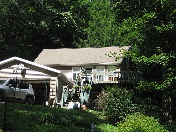Spacious A frame type home in excellent location close to Crane Hollow Nature preserve, bridle stables, Cantwell Cliff and park areas, large great room with glass window wall, efficient kitchen with appliances, small loft, spiral staircase, 3 bedrooms, 2 baths, nice deck, extra storage building, paved drive. Would make great rental or full time living