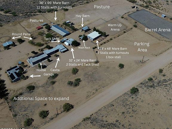 Hay barnOpen floor planBarrel arenaWarm-up arenaTack shedsWash rackFenced dog yard