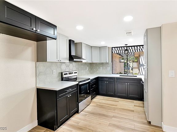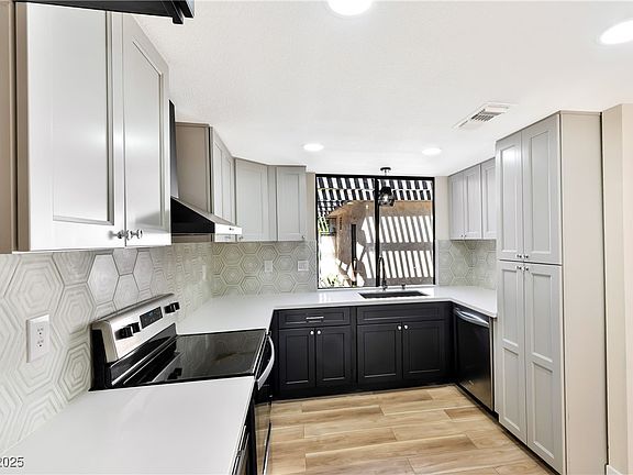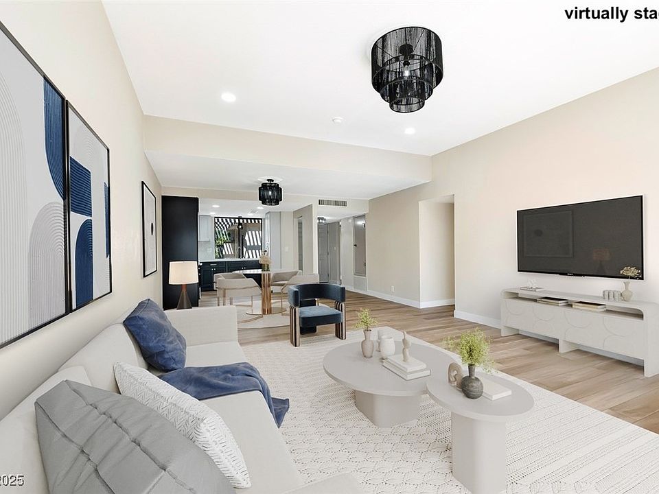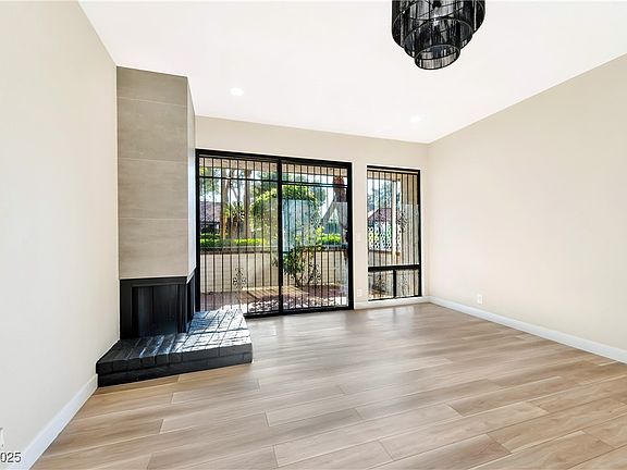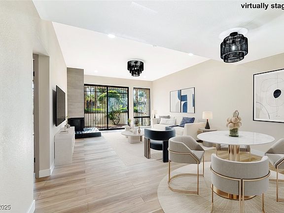 Welcome home to this charming, single-story, 2-bedroom townhouse featuring a covered front courtyard in the gated Sunrise Villas community! Balcony views of the community pool and spa! Community amenities including CC&Rs, handball/racquetball courts, tennis courts, parks, BBQ areas, and more. Conveniently located minutes from the UNLV campus. Inside, you’ll find abundant natural light, an open floor plan, a custom-tiled fireplace, modern lighting, plush carpet, and laminate wood flooring throughout. The well-appointed kitchen offers a peaceful garden view, stylish tiled backsplash, custom cabinetry, sleek countertops with silver hardware, recessed lighting, and stainless steel appliances. Retreat to contemporary, spa-inspired bathrooms featuring dual vanities with framed mirrors, custom lighting, and beautifully tiled showers complete with built-in niches and rainfall shower heads.