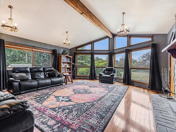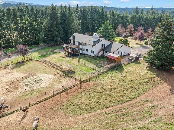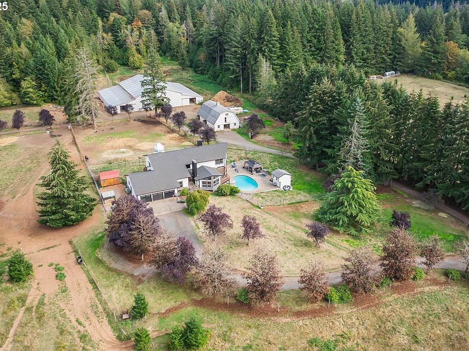 Discover the perfect blend of versatility, and outdoor recreation just 30 miles southeast of Portland, in close proximity to Oregon City. This exceptional estate features a spacious 6,530 sqft, 5-bedroom, 4-bathroom home set on 20 lush acres, offering a range of options with room for everyone, entertaining, and equestrian pursuits. The interior showcases soaring vaulted ceilings, Brazilian cherry hardwood floors, walls of large windows providing incredible natural light, and a seamless flow between multiple living, family, and entertaining areas—ideal for hosting gatherings or enjoying quiet family evenings. The chef’s kitchen offers granite countertops, stainless steel appliances, double ovens, a large butcher block island, and a copper farm sink overlooking pastures. The primary suite includes multiple walk-in closets and an expansive bathroom, perfect as a private retreat. The basement contains a cozy fireplace, kitchenette, and walk-out access to the inground pool and hot tub—perfect for summer entertaining or relaxing year-round. Designed for flexible living, the estate provides options for multi-generational households with ample space and storage galore. Outdoor features include a large pool, patio, and landscaped yard, creating a private tucked away setting. Equestrian amenities include a main barn with up to 18 stalls (12x12), hay and implement storage, a second barn with 5 stalls and attached runs, a 72x120 indoor arena with sand footing, ten fenced turnouts, and onsite riding and hiking trails through the forest—ideal for boarding, training, or personal riding. Additional highlights include a rooftop astronomy observatory, abundant hobbyist options, and a utility/mudroom with an elevated dog wash. An auxiliary garage with power stubbed for a shop or additional ADU. This property offers unparalleled outdoor living, equestrian facilities, and versatile living options—perfect for those seeking an all-in-one.
