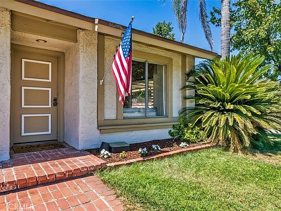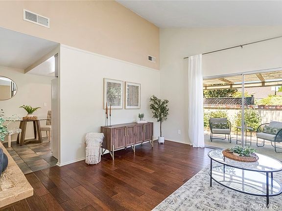 Come see this adorable home situated on a large corner lot on a cul-de-sac in the heart of Valencia. Walk in and experience an open floor plan with 3 bedrooms and 2 baths, cathedral ceilings and tons of windows filling the space with natural light. The Family Room has gorgeous wood flooring, high ceilings and sliding doors that lead out to a beautiful patio space. The kitchen has been upgraded with painted cabinetry, newer hardware and granite counters. The Primary bedroom is large, boasts ample closet space, has an ensuite private bath and doors that lead to a private patio space. Walk outside and enjoy a very low maintenance backyard with lots of patio space, elevated sitting areas, fire pit and a huge bbq island perfect for entertaining. Don't miss the two car attached garage! Close to award winning schools, beautiful parks, community pool, shopping and easy access to the 5 freeway! No HOA and No Mello Roos!!