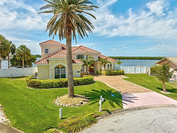 Price to SELL! This stunning home built in 2009, is situated in a peaceful cul-de-sac. The property sits on a pie-shaped lot almost 1/3 of an acre, providing 180-degree panoramic views of the river and breathtaking sunsets. With 4 bedrooms and 3 bathrooms, the property overlooks the wildlife haven of the Cocoa Beach Thousand Islands across the Banana River. Once you enter the home, you will see an amazing water view from the foyer, living area, and main bedroom. The home features a split-bedroom floor plan, tray ceilings, arches, tall baseboards, and lighted niches. Ocean access from the Banana River, the property also boasts a private dock, making it perfect to watch for dolphins, or fishing and boating and the house sits high and dry.