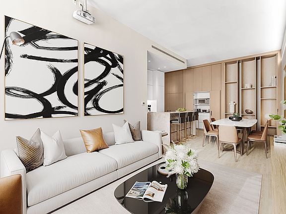 The expansive great room measures over 30 feet and is highlighted by 12-foot ceilings, a wall of custom cabinetry & storage, custom LED lighting, and oversized double hung north facing windows that bring light to the apartment all throughout the day. The great room allows for a number of options for entertaining. The open concept custom kitchen flows seamlessly and features a chef’s kitchen with top of the line appliance package including Sub-zero refrigerator, Wolf range, custom stained oak millwork cabinetry, Nanz bronze hardware, stainless steel cabinets and countertops with Taj Mahal quartzite kitchen island. The kitchen is complete with a wine refrigerator and an appliance cabinet / bar that smartly conceals the microwave. The kitchen is perfect for entertaining, with under counter dining that can accommodate 4 bar stools. Off the kitchen you also have ample room for a 4-6-person dining set.