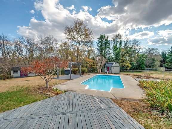 Welcome to this charming and spacious brick ranch located on a friendly and quiet street just minutes from downtown Forest City! This well-maintained home has many recent updates from 2023 including new: roof, A/C, heat pump, ductwork, mini-split, tankless water heater, and new plumbing. Situated on a generous, level lot, this property offers an incredible backyard oasis complete with an in-ground pool, pergola, and multiple storage buildings—perfect for entertaining, gardening, or simply relaxing in your own private retreat. Step inside to find multiple large living spaces. A bright front living room with hardwood floors, a second living room/dining area featuring a gas fireplace, gorgeous patterned flooring, and French sliding doors that open to the patio and pool area and ALSO a flex space that could be used for a home office, extra living space or whatever your heart desires. The welcoming front porch has a warm, wood-finished ceiling and brick flooring that gives the home true Southern charm. The kitchen offers great workspace with ample cabinetry, an island, a gas range, and views into the second living/dining area. A dual-sink vanity highlights the main bathroom, and natural light fills each room of the home. The layout provides flexibility whether you need a home office, hobby space, or extra lounging areas. Outside, the fully fenced backyard is the star of the show—complete with an in-ground pool, large deck, pergola, mature landscaping, and three storage buildings (one 10x20 and two 8x10) perfect for tools, pool equipment, workshop use, or even converting into a tiny home/guest suite for those with big ideas! Roughly an hour to Charlotte, Asheville and Greenville, SC!