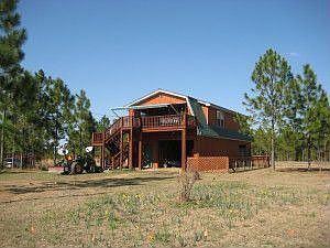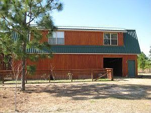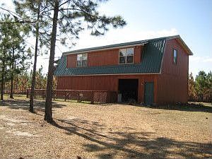 Foreclosure! 47 secluded acres with pines, pasture, and a pond. This Great get-a-way includes a unique home with bedroom and bath downstairs including garage with 2 bays and open room upstairs with everything you need. Large deck to sit on and relax. Located near Little Black Water Park.