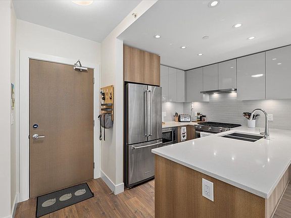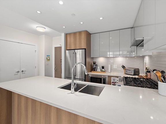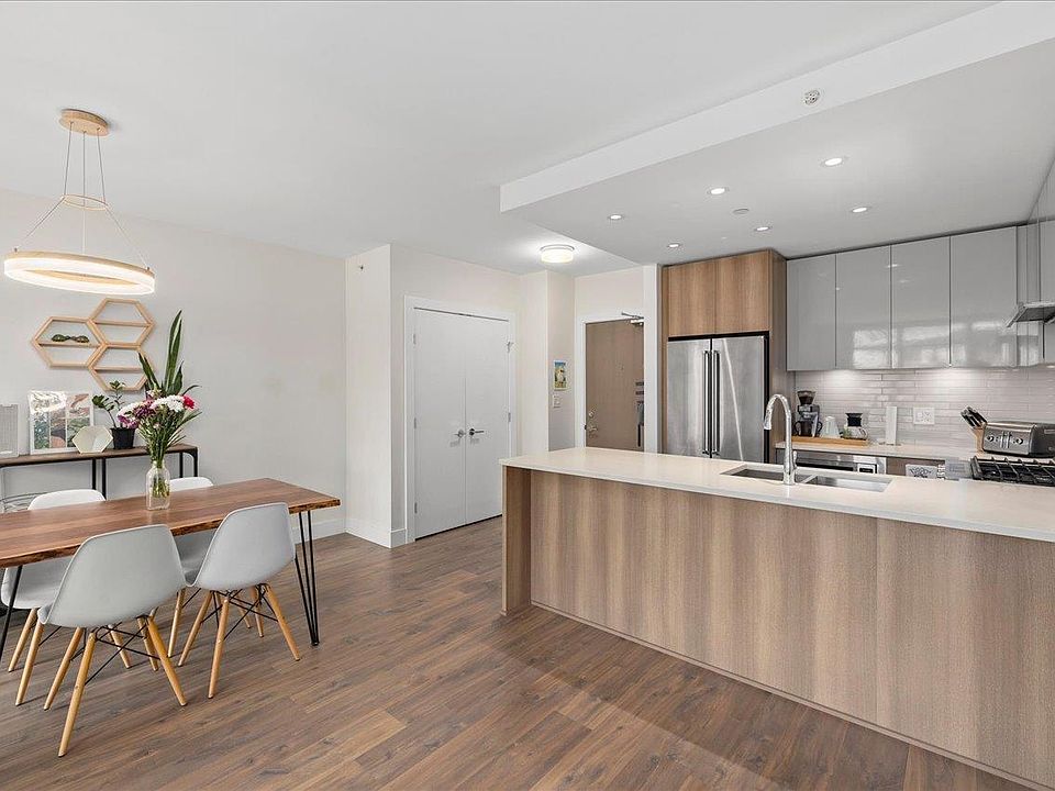 Immaculate 2 bed, 2 full bath ~950 sqft home at THE COLUMBIA—one of the best layouts in the Brewery District! Bright open plan w/ no wasted space & large windows for natural light. Modern kitchen w/ GAS range, S/S appliances, quartz counters & island bar. Defined dining & living areas lead to a quiet court-facing 112 sqft balcony—perfect for relaxing or entertaining. Spacious primary bdrm w/ walk-in closet & ensuite w/ dbl sinks + a good-sized 2nd bdrm ideal for guests, kids, or office. Quality 5 yr old bldg w/ balance of 2-5-10 warranty. 10,000+ sqft of resort-style amenities: gym, squash court, yoga rm, sauna/steam, lounges, comm. garden + wash stations! 1 parking & locker. PRIME location steps to SkyTrain, RC hospital, grocery, shops & restaurants + easy highway access. *MOVE IN READY!*