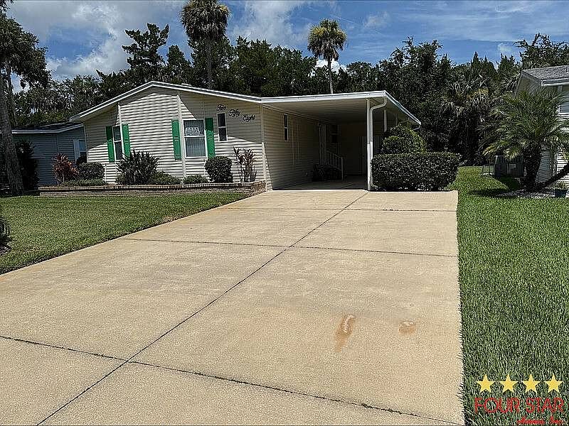 Charming two bedroom, two bath with large 12 x 9 shed and screened patio overlooking the water canal. Mature landscaping, large carport with extra car pad. Young appliances, whole house water softener, water heater installed 2022, AC installed 2015, roof installed 2020. Enjoy the pool year round along with planned activities. Easy access to Bulow Creek boat ramp and fishing. Clubhouse with dartboard and pool tables. Clubhouse also available for private events. Close to beach, shopping and Hospital. Lot rent $663.62 includes water and trash.