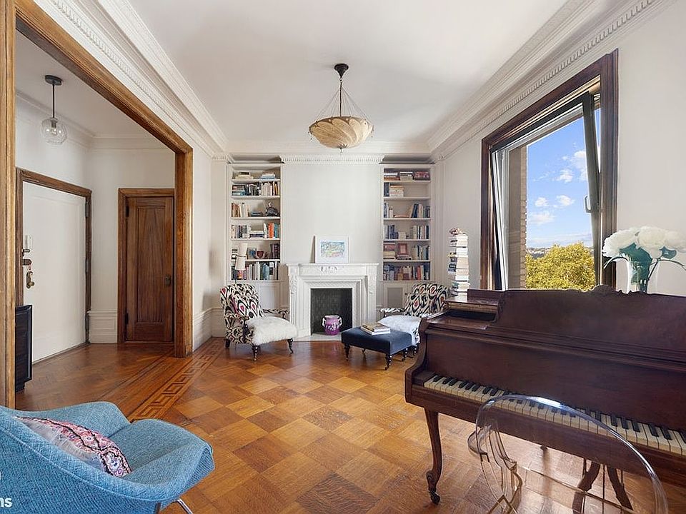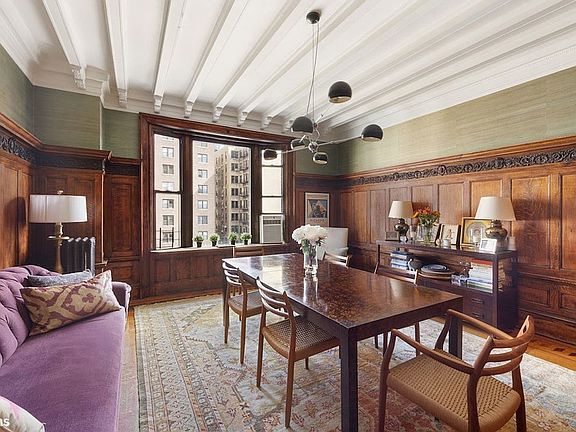 light, air, and open views-every room looks outward, free of brick walls or interior courts. The flexible layout easily adapts to three bedrooms, offering endless possibilities. Inside, the charm is in the details: soaring ceilings, intricate inlaid floors, original mahogany doors, and a paneled dining room crowned with