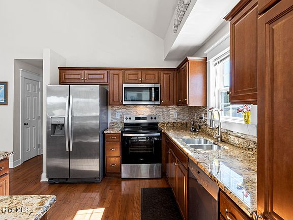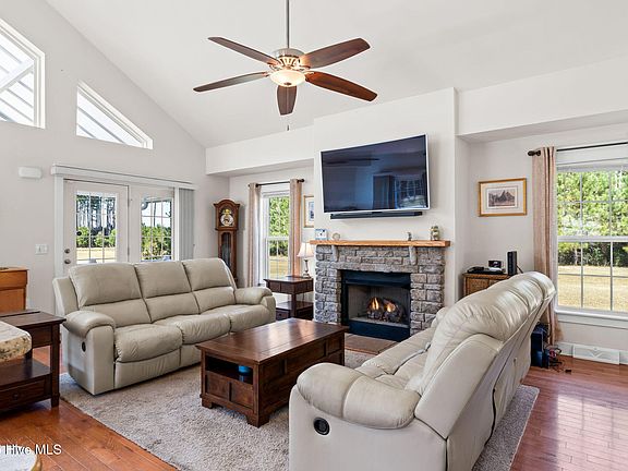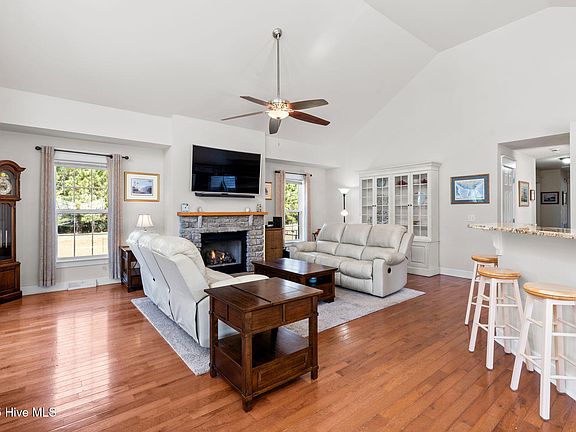 As you approach the residence, you are met with a rocking chair front porch destined for relaxing evening spent counting fireflies and taking in the splendor of the stars. Inside, features an open-concept layout perfect for entertaining. Your eye is immediately drawn to the gas log fireplace which adds to the warm and welcoming atmosphere. Further in you notice that the living area is surrounded by windows that that floods the room with natural light and a soaring ceiling that completes the motif.  The adjacent kitchen includes an island with a high-top bar for extra dining space, granite countertops and finishes off with a dining area large enough for most any sized table. What a perfect place to gather!