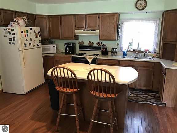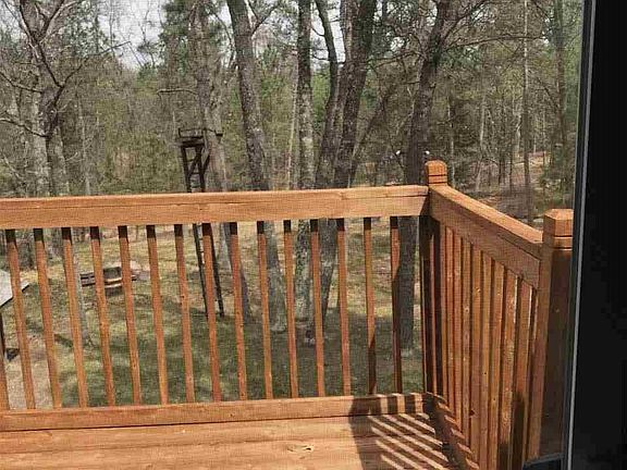 New metal roof in 2017, newer well and hot water heater, natural gas forced air heat and central air conditioning for these hot summer days! When winter comes our way there is a wood stove insert in the living room that will provide a toasty warmth throughout the home. This is a move in ready place, on a large wooded lot surrounded by Government land and located in area of 7 inland all sports lakes. One bedroom on the main level, 2 upstairs. large eat in kitchen with an island, newer wood floors, and an upper level balcony overlooking the wooded back yard. This is a great place to entertain a crew both inside and out!