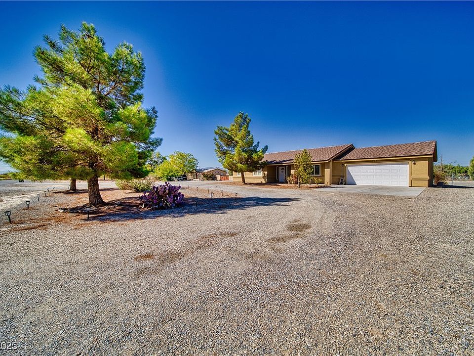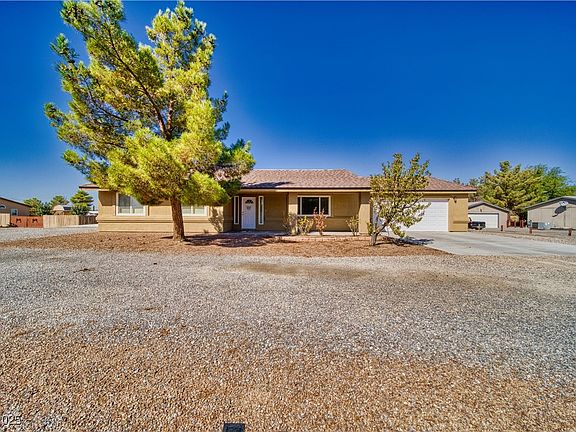 Not located in a flood zone, this 3B 3B home sits on 1.1 acres with mult types of fruit trees. It is also located close to Highway 160 with easy commute North or South if commuting to Las Vegas. Trudy is a short street with access from Blosser Ranch and Bonita. Home has 2 bathrooms and 3rd 3/4 bath is in the detached garage. Bar height breakfast bar between kitchen/living room/dining area. Spacious open floor plan. Primary Suite has a spacious bath with soaker tub, walk in shower, water closet and Walk in clothes closet. Back yard is fully fenced with 6' chain link fencing and drive through gates on both sides of the home. Home has covered front and back patios. 28x30 attached garage and 30x31 detached garage with a 3/4 bath, perfect man cave or workshop. One owner home that is ready for move in. Carpets and home professional cleaned. Professional interior pictures coming next week. Come home to 2580 Trudy in Pahrump Nevada.