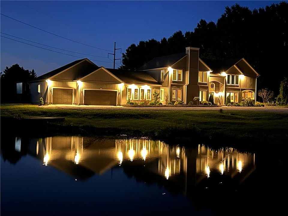 Beautiful unincorporated Blue Springs/Lee's Summit address (it depends on which side of the road you put your mailbox!) - 4 bed, 4 bath, 3 car garage framed for 10' entrance and deep enough for a boat, on 10 acres with beautiful Apple Orchard with several types of Apples you can eat right off the trees, Pear trees, Peach and Cherry tree,Blackberries, Pecan and Walnut trees, stocked ponds with prize Catfish, Bass, and Carp. The land offers paths for walking trails, camping by the pond and hunting. Interior is a custom built home, insulated with Foam for temperature and sound regulation, Brand NEW Carpet and Quartz counterops and backsplash! This home is designed for the extraodinaire entertainer (200 guest easily with plenty of parking). The game room is a must see with a beautiful wet bar (who needs to go to Cheers when everyone knows your name here!) The out building overall is a 30'x70' with concrete floors,electricity and a lean-to with 3 bays. The pictures speak for themselves, but this is a must see in person property. Wear your walking shoes so you can explore the land and plan your next event! Don't forget the Inground pool with pump/shower house with mulitiple entrances into the interior home.