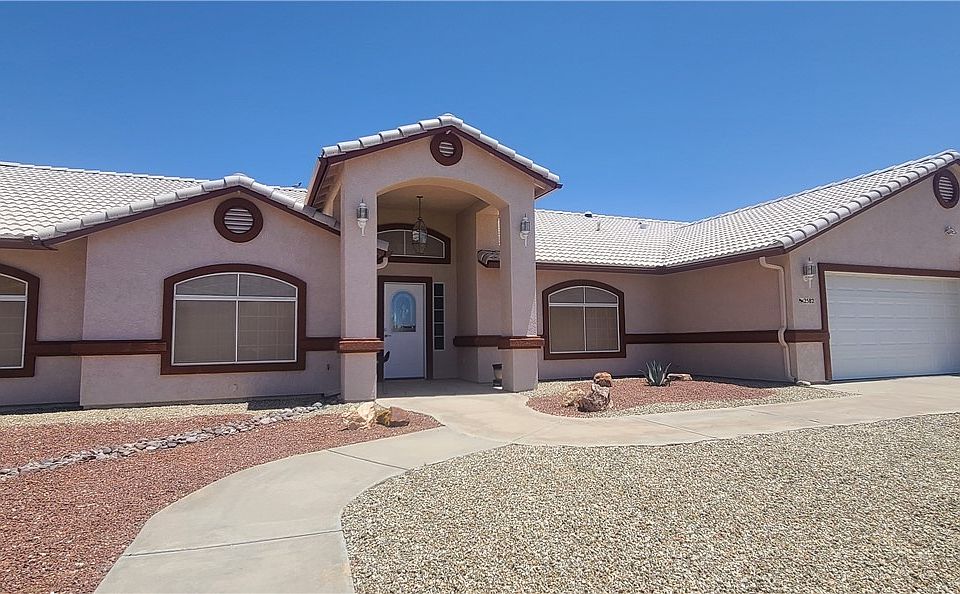 Beautiful home located in the desirable Rancho Santa Fe Subdivision. HALF ACRE LOT. RV Parking, RV Hookup and Dump and 12 ft. RV Gates, . Newly painted exterior and two new garage doors in 2023. Home features 4 bedrooms, 3 baths, 3 car garage, ceiling fans, vaulted ceilings, skylights, and lighted open beam pot shelves. Open living room with an antique mantle/fireplace front(gas log). Vertical blinds throughout. Spacious kitchen with a GE Profile Gas Range/Convection DOUBLE Oven can be five burners or four and a griddle, pantry and two lazy Susan corner cabinets. Kitchen has a large, eat in dining area; formal dining room could be office/library/game room. Large Master suite has a walk in shower, jetted garden tub, dual vanities and a walk in closet with built-ins. Screened in back patio (Arizona Room, 430 sq ft) with doors off of living room and master suite. Fully landscaped front and back. Back yard features Pomegranate, Apricot and Apple trees and a large back patio with fire pit. Unrestricted view of the Hualapai Mountains from the backyard and no back neighbor. Shown by appointment only.