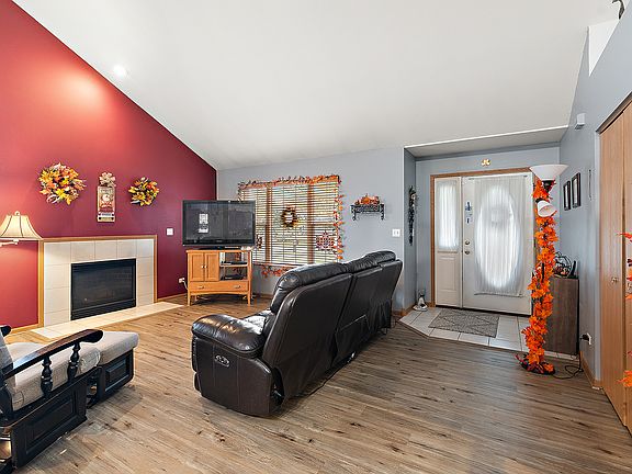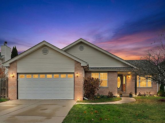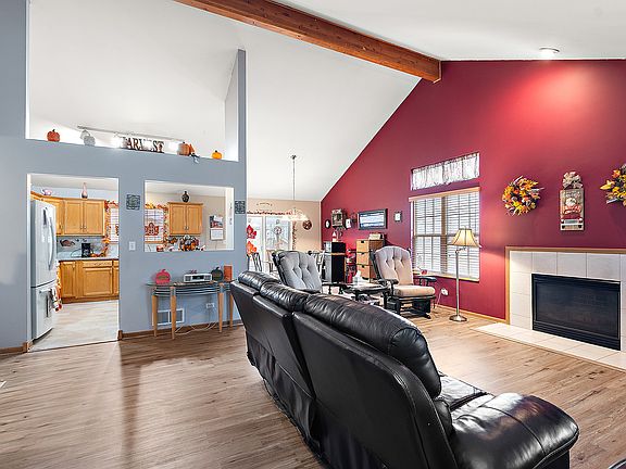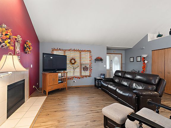 Welcoming covered porch in this RANCH home in The Highlands of Monee. A vaulted ceiling creates an open connection between the family room, complete with a cozy fireplace, and the dining area, setting the tone for warm gatherings and everyday comfort. The adjoining kitchen features white appliances, granite countertops, a stylish backsplash, and an island with seating, making meal prep and entertaining effortless. Solid surface flooring spans the main level, offering durability and a clean, modern look. The full finished basement adds valuable living space with a recreation area and a dedicated laundry room. Out back, the large fenced yard is an outdoor highlight. A two tier deck, patio, and above-ground pool come together to create a private retreat ideal for summer fun, relaxation, and entertaining. Front load, attached 2-car garage. Move in ready and close proximity to shopping, dining and expressways.