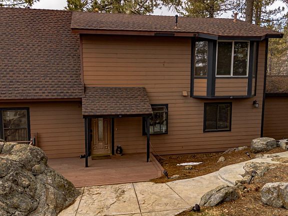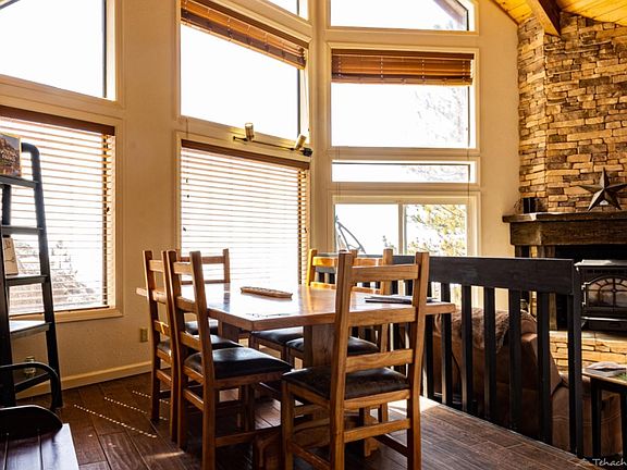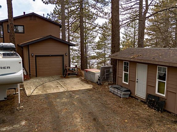 Peace, serenity, privacy and VIEWS! This cabin is nestled between tall pines, mature oaks, rock outcroppings and is absolutely gorgeous inside and out. Outside is a large composite deck where you can sit and watch the sunset or soak in the spa. Inside the home is a beautiful modern kitchen, vaulted ceilings, wood look tile floors, and floor to ceiling windows showcasing the breathtaking views. Just a couple steps down from the kitchen and dining area is the living room with an efficient pellet stove for those cold winter nights. Down the hall are two bedrooms, a bathroom and access to the attached garage. The upstairs is the perfect primary suite with a large bedroom, a walk in closet, a bathroom and an additional space currently used as an office. With stunning views from every window, a modern interior, RACE internet, a shed outside for storage and over 2 acres of usable land this cabin is sure to check the boxes and impress any buyer!
