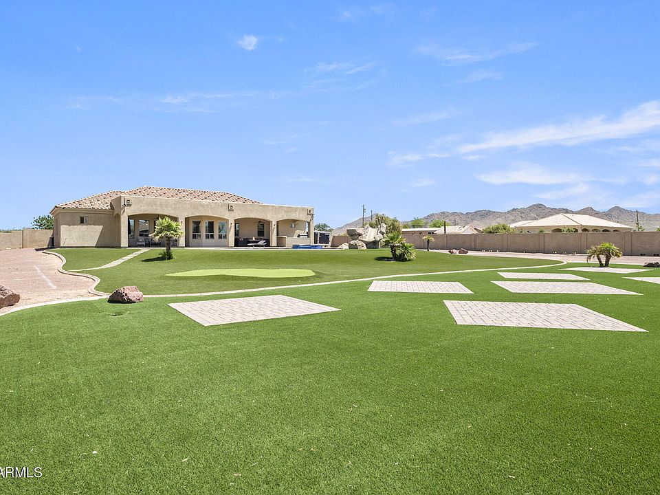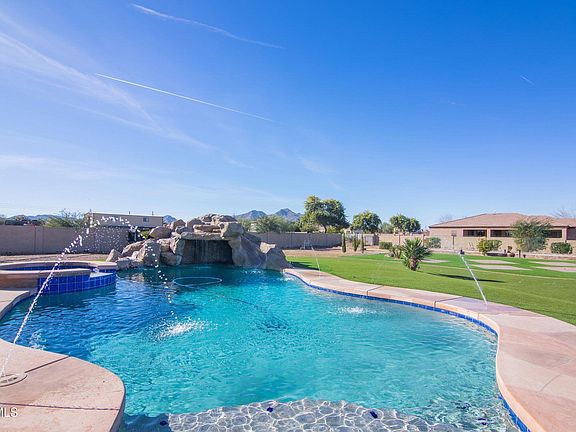 MOUNTAIN VIEWS! BEAUTIFUL CUSTOM HOME on ACRE+ lot located on the boarder of Gilbert/Queen Creek w/RV GATE & NO HOA*Low maintenance front/backyard w/turf & circular driveway*Resort style back includes pebble tech pool with slide, grotto, & spill over spa, built in grill/bar, extended patio length of house, pavers perfect for entertaining large parties, putting green, plenty of space for a future workshop/RV garage/ADU/Batting cage....options are