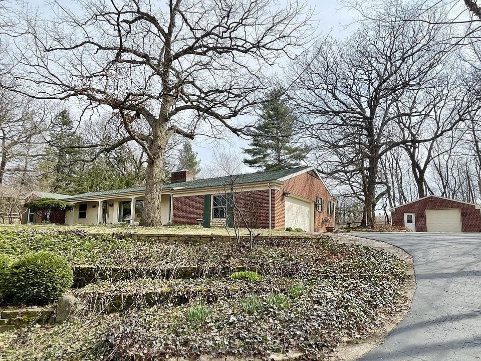 Exceptional find in Lynnwood subdivision! 3 bedroom 2.5 bath ranch style home nestled into a gorgeous private setting with 2 car attached garage plus an impressive detached two-car/workshop. The covered front porch leads to a unique open floorplan of cathedral ceilings, amazing windows and hardwood flooring. The living room, dining area is separated only by the 2-sided fireplace. Main level laundry and a bright custom kitchen featuring large push-out windows, granite countertops, a large island/breakfast bar with cooktop, wine rack and small bar sink. Dining area offers French door access to a spacious sunroom with cathedral ceiling and gorgeous landscape views. Office/possible 4th bedroom with custom desk and cabinets, 2 bedrooms with ample closets and a primary bedroom suite which features a sizable bathroom complete with heated ceramic floor, ceramic stone walk-in shower and linen closet. Basement provides extra living, dining and entertainment space. Separate utility workshop and ample storage. Furnace 2020, water heater 2020, sump pump 2021. Washer/dryer 2015. Refrigerator 2015. See Additional Information for more updates.