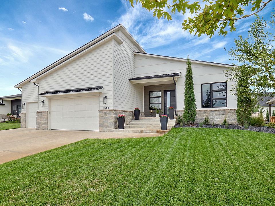 Welcome to Emerald Bay, where everyday living feels like a getaway! This stunning 4-year-old split-bedroom ranch blends modern design with the relaxed lake lifestyle you’ve been wanting. From the moment you arrive, the curb appeal sets the tone with crisp white paint and a striking glass front door. Once you step inside, you’re greeted by light-filled spaces designed for comfort and entertaining. The main floor living room is a true focal point, with a gas fireplace framed by floating cabinets and shelves and big windows that capture views of the deck and backyard. The open kitchen makes hosting a breeze with quartz countertops, a massive island/eating bar, gas range, double ovens, walk-in pantry, and under-cabinet lighting. A spacious laundry with a sink and drop zone keeps life organized, while the primary suite feels like a retreat with its accent wall, spa-inspired shower, dual vanity, and expansive walk-in closet with direct laundry access. Downstairs, the walkout basement is ready for game nights and gatherings with a huge rec/family room, beautiful wet bar, two bedrooms, a full bath, and plenty of storage. Outdoors, enjoy evenings on the covered deck with privacy slats, relax on the patio, or take advantage of the fenced yard, sprinkler system, and irrigation well. The oversized 4-car tandem garage with rear exit is ideal for storing a boat or jet skis—perfect for lake living. And what a lifestyle it is! Emerald Bay’s 100-acre ski lake offers boating, swimming, paddle boarding, and fishing right from sandy beaches and private docks. A nice clubhouse, pool, pickleball courts, and sand volleyball court create an incredible sense of community. Furthermore, this home sits off the water on a quiet cul-de-sac—making it a more affordable way to enjoy all the fantastic amenities of lake living without the waterfront price tag. Located in the desirable Maize South School District with easy access to shopping, dining, and highways—this home proves that everyday can feel like vacation.