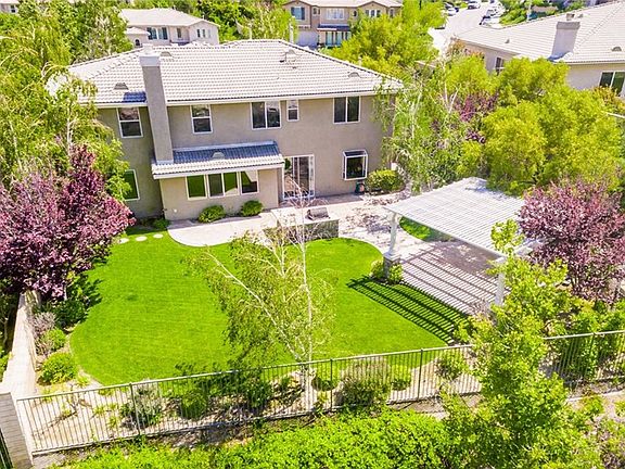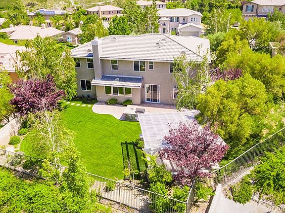 Terrific Southern Oaks view home with pool sized lot! Move-in condition with sharp wood floors, shutters, crown molding, upgraded carpet and iron staircase. Upgraded kitchen offers nice stainless appliances including built-in fridge, granite counters and backsplash. All very neutral. Large yard with flagstone hardscape, BBQ and gazebo with stunning views of the hills and down Pico Canyon. Popular open floor plan features full bed & bath plus office down. 4 bedrooms & 3 baths up. 3-car tandem garage with storage. The Southern Oaks HOA has a clubhouse, community pool, tot lots and open space. No Mello Roos.