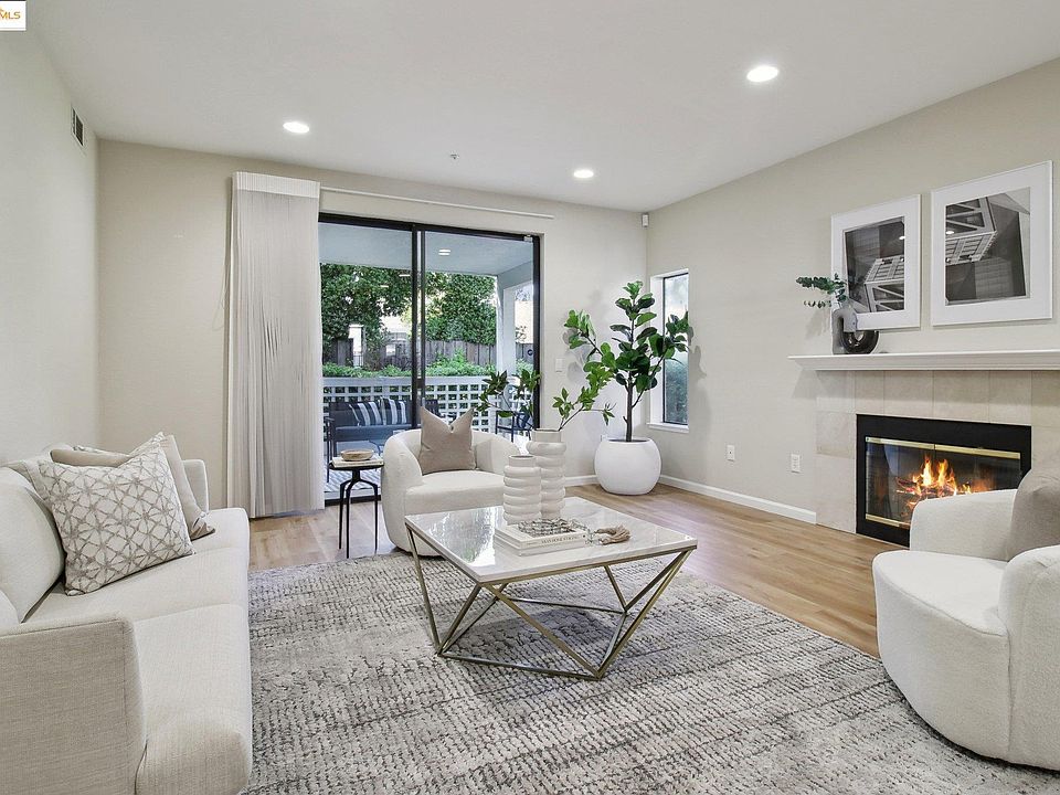 Discover the perfect blend of style, convenience, and comfort in this beautifully updated 2-bedroom, 2-bathroom end unit condo with high ceilings. Two private patio spaces—perfect for morning coffee or al fresco dining expand the space and offer a quiet retreat.Step inside to find a light-filled open floor plan with stylish flooring throughout, breathtaking 10-foot ceilings, a cozy fireplace and modern kitchen equipped with a brand new Samsung refrigerator. Featuring in-unit washer, dryer and air conditioning! The spacious living and dining areas flow effortlessly for everyday comfort or gatherings. Both bedrooms are generously sized with closet space with built-ins, and you'll love the abundant storage throughout the unit. Enjoy easy access to shopping, dining, parks, and top-rated schools, along with nearby BART and freeway access for a quick commute to San Francisco or Oakland. Whether you're a first-time homebuyer, downsizing, or seeking a low-maintenance lifestyle close to everything Walnut Creek has to offer—this home checks all the boxes.Don't miss this rare opportunity to own a move-in-ready ground-floor condo with outdoor space in one of the East Bay’s most desirable communities.