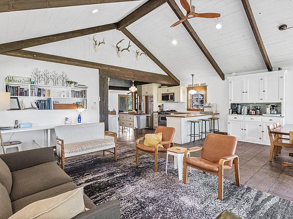 Nestled on over 2 acres by serene Whaletail Lake, this picturesque rambler offers ultimate privacy. Surrounded by mature trees, this home offers absolutely stunning lake views. Step into the spacious family room featuring soaring 10-foot vaulted ceilings accented with shiplap and wood-beams. The gorgeous stamped concrete wood-like floors provide durability, while large windows frame breathtaking lake views. A seamless transition to the backyard ensures effortless indoor-outdoor living. This beautiful kitchen boasts stainless steel appliances, butcher block and stainless steel countertops, and a white subway tile backsplash. The peninsula with breakfast bar seating invites casual dining, while the adjacent informal dining area, complete with a built-in buffet, adds extra storage and charm.