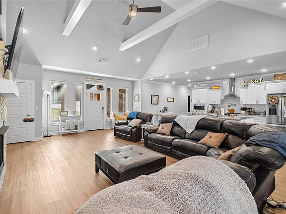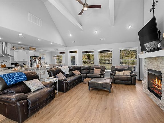 Golf Course-Front Elegance Overlooking Hole 1 Tee Box! This stunning 2021-built, one-owner, 4BR, 3BA home with a bonus room is loaded with custom features. The exterior boasts brick & hardi board, cedar porch beams, and a whole-house gas generator. Inside, the living room features a gas log fireplace and vaulted ceilings with accent beams. The gourmet eat-in kitchen has granite counters, stainless appliances, and a walk-in pantry. A unique extended utility room connects to the owner's bath. The Owner's Suite features dual walk-in closets, a soaking tub, and a walk-in shower. Matching LVP flooring extends into the owner's bedroom and the downstairs office/bedroom. The back yard is great for entertaining with iron fencing for golf course views, an extended composite deck, and a hot tub that conveys. Upstairs includes two bedrooms, a full bath, and a bonus room. Additional perks include a mini-split HVAC in the garage, insulated garage doors, trim lights, and sprinklers with a separate water meter.
