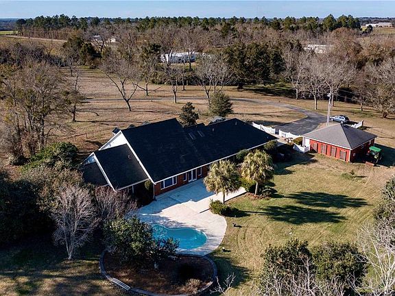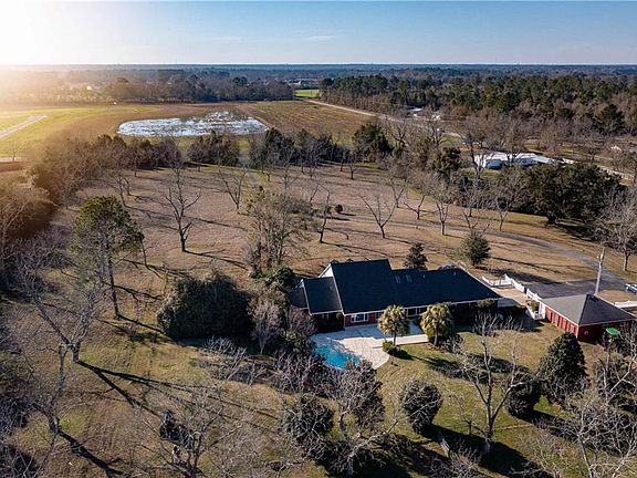 A sprawling one-story estate sits tucked away on 17.7 acres of serene, private land with horse barn and detached garage, just 20 minutes from downtown Mobile. Built in 1992, this beautifully maintained open concept home is just over 3,900 sq ft. Ideal for entertaining the separate dining room opens to a sprawling living area with double sided gas fireplace perfectly positioned maximizing privacy and taking advantage of the peaceful views of pool, pastures and half acre lake back patio, inground gunite saltwater pool and rolling pastures. With the same views and just off the living room are the kitchen and breakfast areas with a 7 x 5 bar (with a wine and small fridge). The garage was remodeled into a 21 x 19 den with charming split brick floors and lots of built-in cabinetry. Home features include granite counters, spacious bedrooms including a huge guest suite. Anderson windows were installed in approx. 2004. The laundry room also includes the pantry area. The primary en-suite offers a jetted tub, walk-in shower, dual vanities, water closet, linen cabinet, and two walk-in closets. There are two gas water heaters, one is tankless. The interior has been freshly repainted, and all the inside plumbing has been replaced. Both HVAC systems (inside and out) were replaced in Q4 2025. Roof replaced in 2019. Out side you'll find an exceptional barn, including a 7-stall horse barn, 1 stall currently used for feed, with huge fans, running water, 2x6 plank construction and rubber mat flooring. There are 3 pastures and 5 paddocks with cross tied fencing. More features include a chicken house, established southern trees, and a detached, finished 2 car garage with abundant attic storage. There is a large buffer area behind the property reserving long-term privacy. What a rare opportunity for country living with modern updates and convenience! Buyer to verify all information during due diligence.
