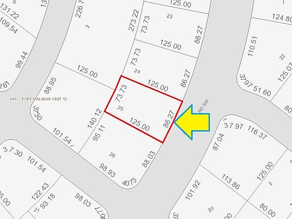 The 0.23 acre vacant lot is available in Port Malabar Unit #52 of Palm Bay. There are no utilities present at this lot or in this area; so the lot and the unit are not build-able. The seller has no knowledge of the property and makes no representations except for title. This property is for investment purposes only in the future of Palm Bay. From exit #176 of I-95 go west on Palm Bay Road for .7 miles, left on Minton Road for 3.3 miles, right on Jupiter Boulevard and quick left on DeGroodt Road for 2.5 miles. Turn right on J.A.Bombardier Boulevard for 1.4 miles, and left on Sapodilla Road. The lot will be on your right in 1.4 miles.