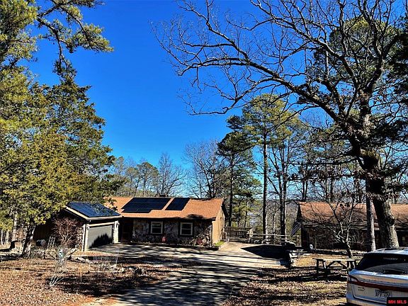 Private wooded setting with seasonal lake view, on 3.8 acres m/l that joins Government land and Norfork Lake, Jordan Marina 0.3 mile away. All roads paved to this rock and stone home. Open great room plan and huge family room with tree house views of this pretty land. 30'x30' extra detached garage/workshop, also a 60'x11' RV carport. Quartz countertops and stainless appliances show off this kitchen with pantry and lots of storage. Convenient 4 stool bar for a quick breakfast or lunch. Finally, a new 28 panel solar array with Tesla battery for minimum electric bills. Tritoon pontoon boat at marina is negotiable. Don't miss this opportunity!