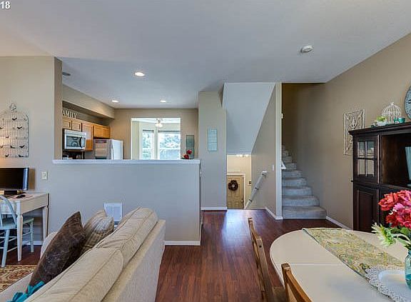 Charming Townhome w/ 3 bedrooms & 2 full bathrooms. Open concept den-office/nook on the main floor off the kitchen. 2 bedrooms on the upper level include vaulted Master Suite and 3rd bedroom/bonus room is on the lower level (no bathroom). Oversized 1 car garage w/ storage area. Great floor plan with open space and room for everyone! HOA is painting this summer, Roof done 2017!
