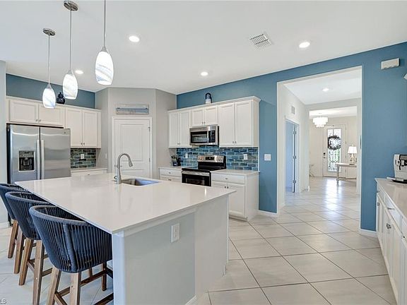 Welcome to this highly sought after, Lennar built, Marsala floor plan featuring 3 bedrooms + den, 3 bathrooms and an extended lanai with a luxurious pool and spa. This stunning home boasts plenty of private space with its generously oversized lot and its end-of-street location, allowing you to enjoy your little piece of paradise in peace. The elegant foyer space leaves an immediate impression as you enter the home and the stately hallway leading into the great room provides an element of separation for residents or guests in the guest-rooms or den. The hallway opens into a stunning great room, where the kitchen, featuring three walls of crisp, white cabinetry, an expansive quartz counter top, walk-in pantry and stainless steel appliances give way to the impressive living and dining space, featuring a coastal focal wall and automated privacy shades. Step into the spacious primary suite that is further complemented by a board and batten accent wall, two walk-in closets, a soaking bathtub and separate shower. Through the glass sliders, which open off of the great room, you will find an outdoor oasis, complete with an in-ground pool and spa, bar & grill space, and plenty of shaded, under-roof living space that can be optimized for almost any outdoor occasion. With additional exterior landscape lighting, an epoxied garage floor, and beautiful details throughout this home certain to delight. Orange Blossom Ranch is also home to two resort-style pools, tennis and basketball courts, a modern fitness center, volleyball, bocce, a playground, and plenty of other recreational opportunities, including Big Corkscrew Island Regional Park, which is just a short drive away. The surrounding area offers convenient access to A-rated schools, shopping, dining, and the immaculate beaches and attractions of Southwest Florida.