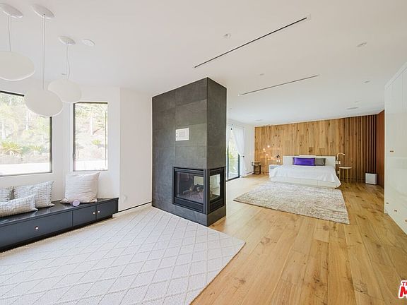 Nestled in a serene cul-de-sac within the prestigious guard-gated Mountain View Estates, this extraordinary contemporary smart home spans 4,800 square feet of meticulously designed living space. Recently renovated with no detail overlooked and no expense spared, it offers an entertainer's dream environment where style and functionality merge seamlessly. Designed for an exceptional indoor/outdoor lifestyle, 18-foot Fleetwood pocket doors open to an expansive outdoor retreat, complete with a zero-edge pool, spa, and three cascading waterfalls. The private oasis features beautiful wood decks, majestic king palms, a double-island outdoor kitchen, fire pit, and an immersive, amphitheater-quality sound system. The grand primary suite occupies the entire rear section of the home and serves as a luxurious sanctuary. With a floating steel staircase, Italian porcelain floors, reclaimed wood accent walls, and custom 3-gang LED fixtures, this space exudes sophistication and tranquility. The suite also includes a cozy lounge area, a fireplace, spacious walk-in closets, and opulent rose gold hardware and fixtures. For the culinary enthusiast, the chef's kitchen is a masterpiece, boasting high-end Miele appliances, custom glass cabinetry, and a striking butcher block center island. This residence exemplifies modern luxury, offering an unmatched combination of contemporary style, cutting-edge technology, and extraordinary outdoor living spaces.