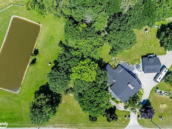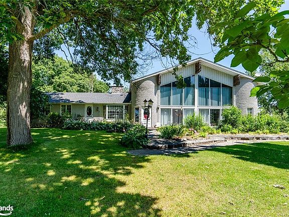 This home on 3 acres needs a family! Boasting 5 bedrooms, 3 full baths and almost 4000 sq ft of living space. There are so many unique spaces in this home, you will be surprised! Large kitchen and family room with additional living room and casual dining space. Two sunroom areas offering another space to enjoy & feel like you are outside but protected from the elements. One sunroom leads you to the back canopy covered deck and the other faces the pond. Loft style primary bedroom, two large closets, dressing area, bath with claw tub and spiral staircases are just some of the unique features. Basement offers games room, workshop and a great space for a bar along with handy walk-up to the driveway, wood shoot, cold room and lots of storage space. There is also a double detached garage with full size garage door at the back and loft on top. Portable garage to park your RV and barn for your other toys you want to protect. Hot water tank is electric. Heating is propane forced air. Shingles were replaced on home approximately 2018 and garage 2019. The original home was built in 1965 and the addition was approximately 1992. Interlocking driveway with path towards the commercial property, pond and sprinkler system make this a complete package. Short distance to highway 400.