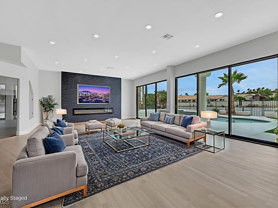 Gated, 3336 sq ft waterfront 3 bed, 4 bath home w/a den features an open-concept layout & has been fully renovated. Enjoy new interior & exterior paint, all-new flooring throughout, & a redesigned kitchen & living space that’s perfect for modern living. The gourmet kitchen boasts custom cabinetry, quartzite countertops, a large island, & a walk-in pantry w built-in shelving. Ideal for entertaining, home includes a wine room & dual 12-foot sliding glass doors that connect the indoor living area to a breathtaking backyard w/views of the lake, mountains & pool w/new plaster & tile. The living room has custom accent wall w integrated lighting, electric fireplace, & included 85-inch TV. All 4 bathrooms have been completely updated w contemporary finishes. The modern staircase & updated primary suite balcony railing add to the home's upscale aesthetic. The primary suite offers its own fireplace accent wall, dual walk-in closets—one of which is perfect as an office, nursery, or workout space.