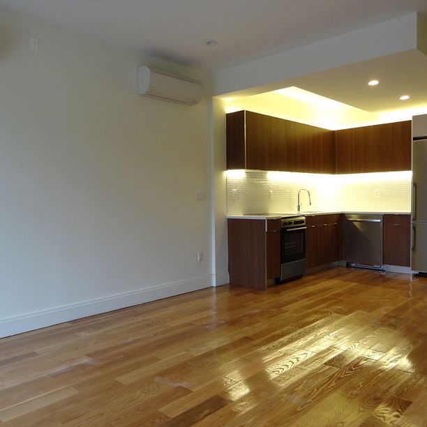 High-class renovations in this one of a kind apartment located on a beautiful tree lined block in Crown Heights. This is a first floor duplex apartment with large living room & bedroom upstairs. Basement level can be used as a bedroom or second large living room area. Building has laundry and a roof deck!