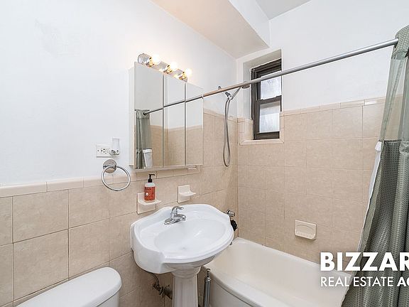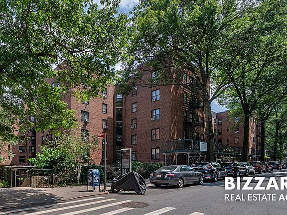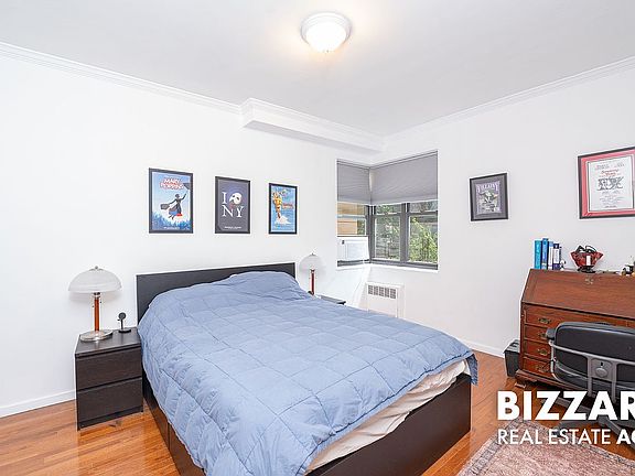 A generously sized bedroom boasts corner windows, a walk-in closet, and enough space for a desk in the corner. The bathroom with its wall-to-wall tile has a pedestal sink, a deep soaking tub and shower combo, and a window ledge. Fort Tyron Gardens is a highly regarded pet-friendly co-op community with a live-in super, courtyard gardens, a bike room, laundry, storage lockers, and parking.