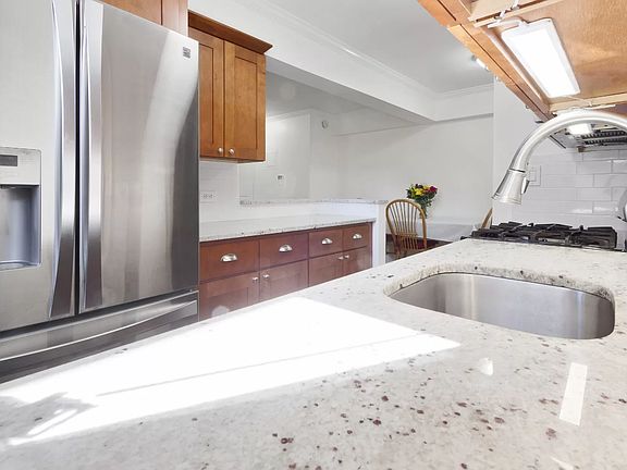 The airy open concept grounded on hardwood floors makes for easy entertaining, and the flexible space of the dining alcove has enough room to accommodate an office area, if so desired. The efficient windowed kitchen features granite countertops, cherrywood cabinets and higher end, recently installed stainless steel appliances. The renovated bathroom is spotless, with elegant details. There is ample storage in the four closets. The bedrooms are serene.