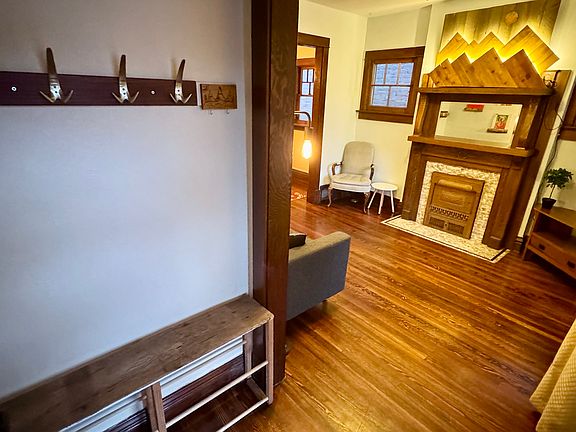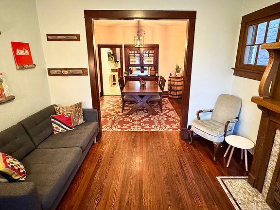 - Living Areas: Dining room table/chairs with leaf, original wood floors, fireplace (not functioning), custom wood artwork, couch/chairs/lamps