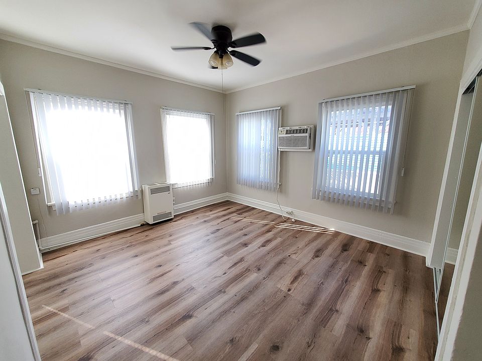 This unit comes with new paint, hardwood floors, tile countertops on kitchen cabinets, stove, fridge, tile floor in kitchen and bathroom, vertical blinds throughout, wall ac unit, ceiling fan, mirror closet doors.