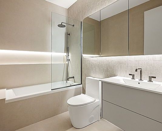 A gracious foyer with interior mailboxes sets a welcoming tone for the building. The residence opens through a solid core wood door with keypad entry, while a mounted iPad manages the video intercom system. A cost closet and full bathroom are to your right, where you will also find the washer/dryer. On the left, the U-shaped kitchen with gas cooking, sleek counters, and tons of space to move around.
