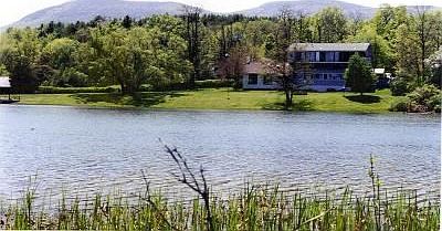 PRIVATE LAKEFRONT RETREAT Former inn overlooking 8 acre priv lake; 3584sf converted barn with 2 lg grtrms w fps 28x40, 28x28, commercial kitchen, owners residence above additional kitchen + 9 sm units, separate sm gst hse, 4680 sf prerevolutionary house.