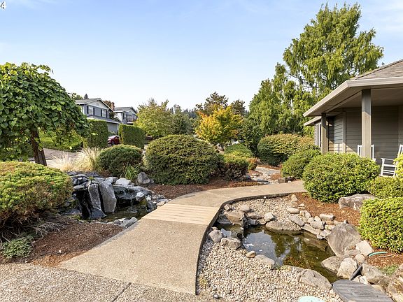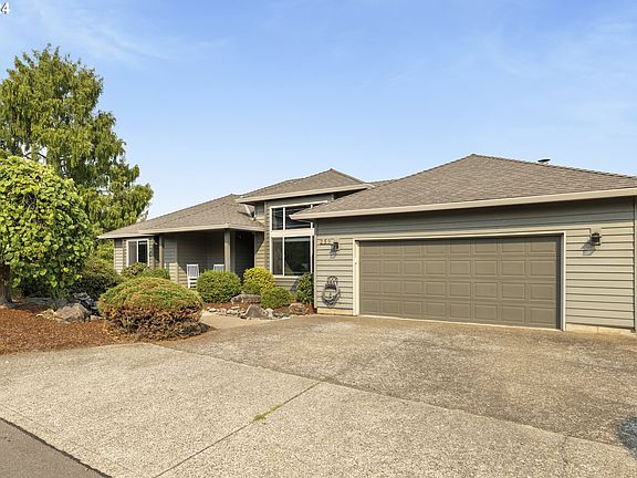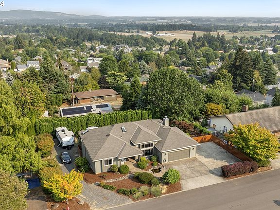 Nestled in the Dundee Hills, this home offers dual living with breathtaking panoramic views of the valley, Four Graces Vineyard, & the majestic Mt. Hood & Mt. Jefferson on a clear day. Enjoy glorious sunrises & watch hot air balloons drift over the horizon from the comfort of your expansive TREX deck. Inside the home, the formal dining room impresses with soaring ceilings, oak hardwood floors, & built-in shelving with secret storage. A large window provides a serene view of the tranquil pond in the front yard. The well-appointed kitchen offers SS gas appliances, granite countertops, oak cabinets & floors & a large island with eating bar. Flowing seamlessly into the living room, this space is perfect for gatherings, while the wood-burning stove & expansive window capture the awe-inspiring views. The spacious primary bedroom boasts private deck access, an en-suite bath, & a walk-in closet. Completing the main level are 2 auxiliary bedrooms & a versatile den with French doors, perfect for a home office or additional living space. Downstairs, you'll discover fully equipped separate living quarters with private exterior access. A beautiful 2nd kitchen with dishwasher, range & eating area opens to a cozy family room, complete with a gas fireplace. The 2nd primary bedroom features high ceilings & a private bath with a walk-in shower. The lower level also features tons of storage & a large unfinished bonus room, ideal for a home gym, hobby space, or future home theater – the options are endless! Additional amenities include 2 laundry rooms (1 on each level) for added convenience, a fenced yard, RV parking with a 50-amp hookup, water & easy sewage access, as well as a paved pad with basketball hoop. The home also includes a whole-house water filtration system & a radon mitigation system. You’ll enjoy frequent visits from wildlife, including eagles & deer, making this home a tranquil retreat. With its unmatched views & endless features, this Dundee Hills gem truly has it all!